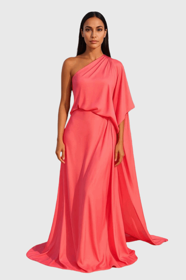 Asymmetric Shoulder Draped Gown In Salmon